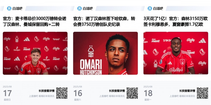 值得注意的是,诺丁汉森林在8月16日已相继签下哈钦森和麦卡蒂两位新援,加上卡利穆恩多,俱乐部在短短72小时内引援支出突破1亿欧元大关。今年夏季转会窗,森林队的引援总投入已超过1.7亿欧元。